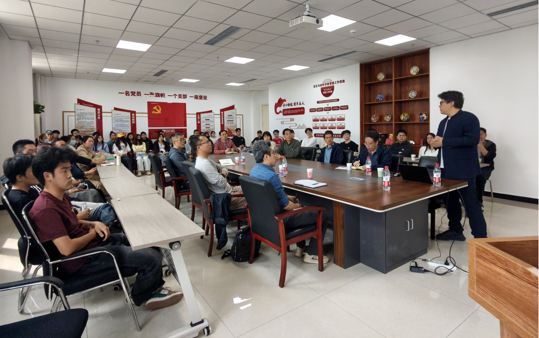 在交流讨论环节,边亮教授与学院师生展开深度互动,耐心倾听师生们在科研探索、学术研究及学习实践中遇到的困惑与思考。围绕大数据分析在矿物材料领域的应用、尾矿资源化高效利用、玄武岩纤维产业化发展等热点议题,与师生们进行了全面深入的探讨交流。