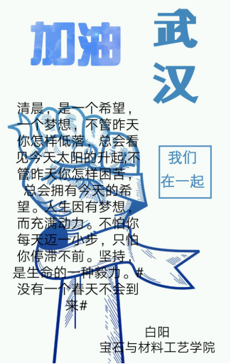 宝石学院党支部邀请大家为武汉献上祝福,为英勇的人民唱响赞歌。同学们积极参与,作品如下: