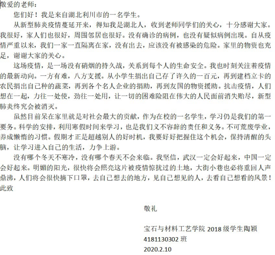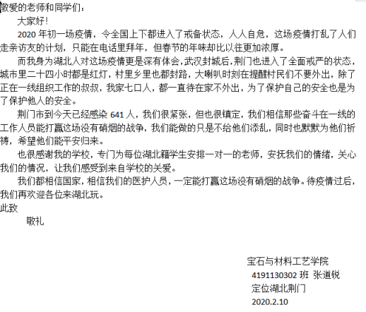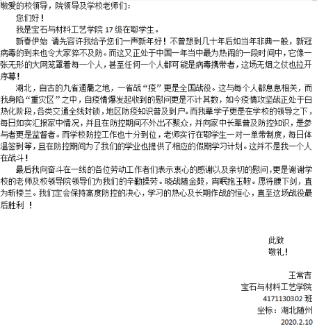 一场突发的战“疫”给庚子年增添了几分特殊。这场战“疫”,让我们感受到了病毒的无情,更让我们感受到了人心的温暖,感受到了祖国的强大、感受到了一方有难八方支援的磅礴力量。疫情发生以来,学校采取一系列防控措施来保障全校师生的安全和健康。宝石院的辅导员和班主任主动出击,积极作为,火速确认学生的寒假去向,密切关注重点疫区学子们的身心状况;他们采取线对线、键对键、面对面等方式,时刻牵挂着五湖四海学子们的安危。面对老师们的急切关心,宝石院在湖北地区学生也向母校报平安!