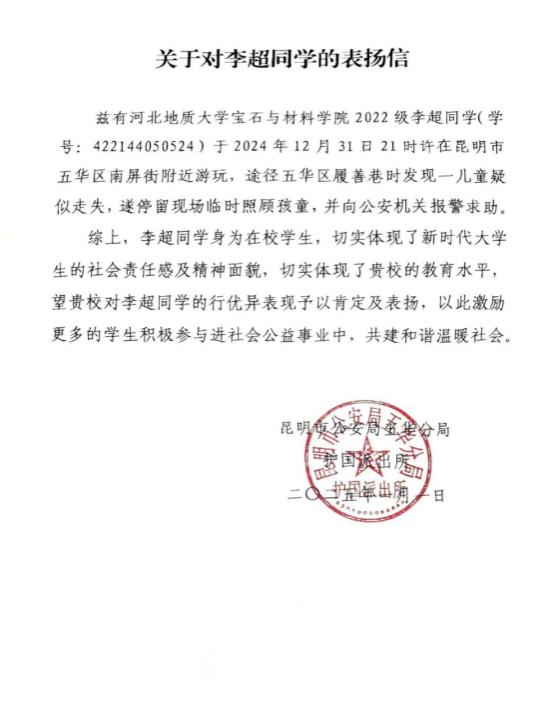 近日,大奶做爱 的学子李超在平凡的日子里展现出了不平凡的担当,以实际行动传递了温暖与正能量,其热心助人的事迹,通过昆明市公安局五华分局护国派出所的一封表扬信向我们展示出来。