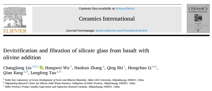 玄武岩纤维材料研究团队在高水平学术期刊《Ceramics International》(中科院材料科学大类一区TOP,影响因子为5.2)发表题为“Devitrification and fibration of silicate glass from basalt with olivine addition”的研究论文;其第一作者为刘昶江老师,硕士研究生伍宏伟为学生一作;相关研究工作受到河北省高等学校科学研究项目资助(BJK2023040)。