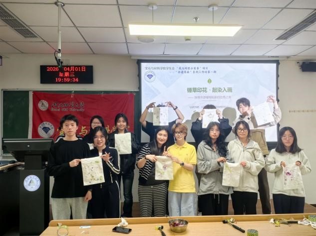 创作完成后,同学们展示作品、交流心得,纷纷表达了对植物拓染的喜爱和对非遗文化的新认知。活动最后,全体学员手持作品合影留念,在欢声笑语中为本次体验画上圆满句号。