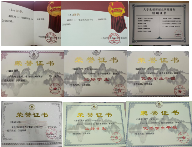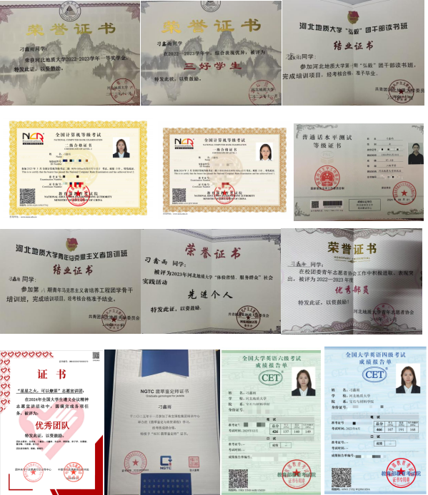 第十期“弘毅”团干部读书班结业证书,2024年全国大学生遵义会议精神志愿宣讲活动优秀团队,大学生创新创业训练计划校级立项,持有英语四级、英语六级、计算机一级、计算机二级、普通话水平测试等级证书及NGTC翡翠鉴定师证书。
