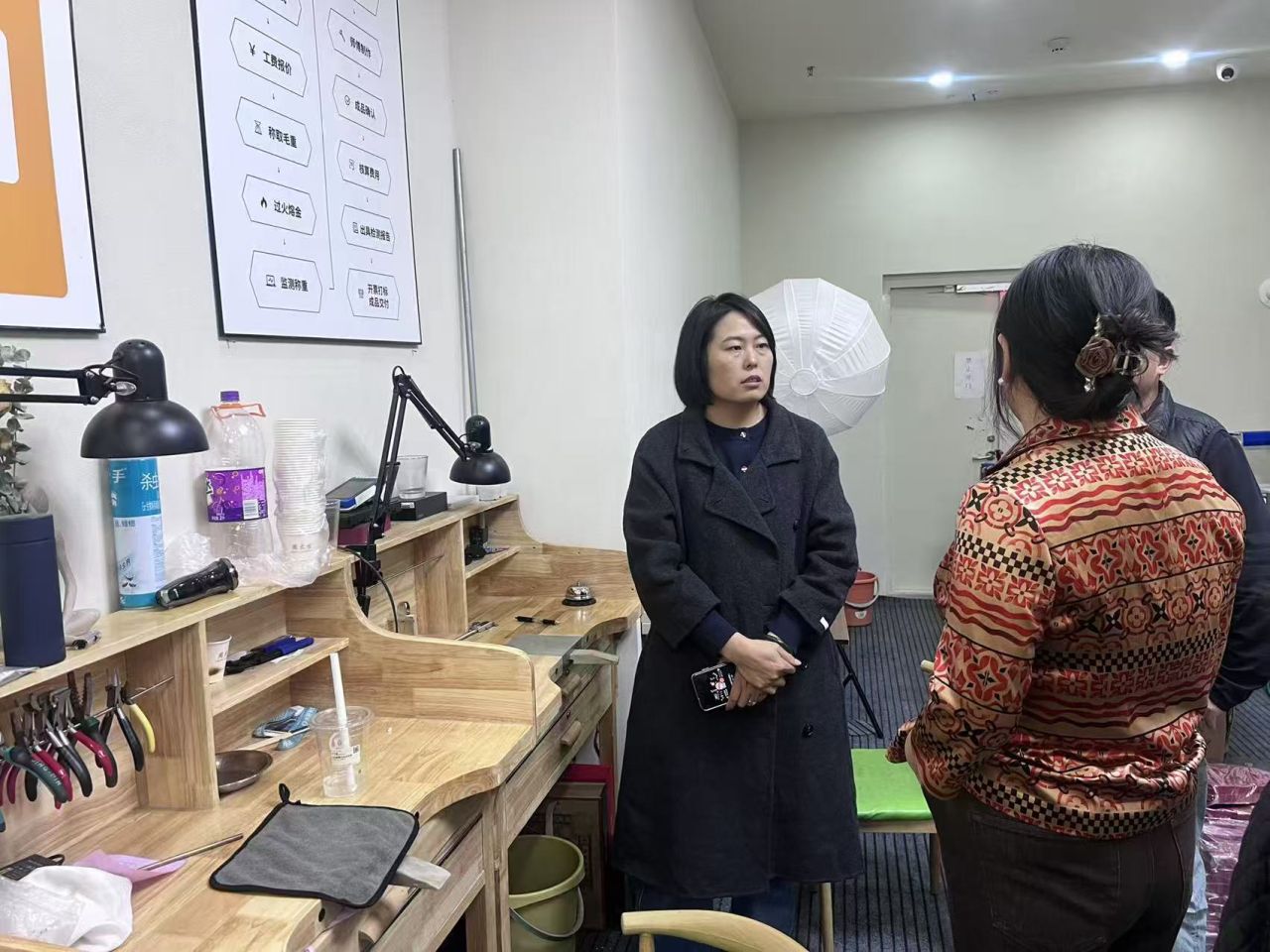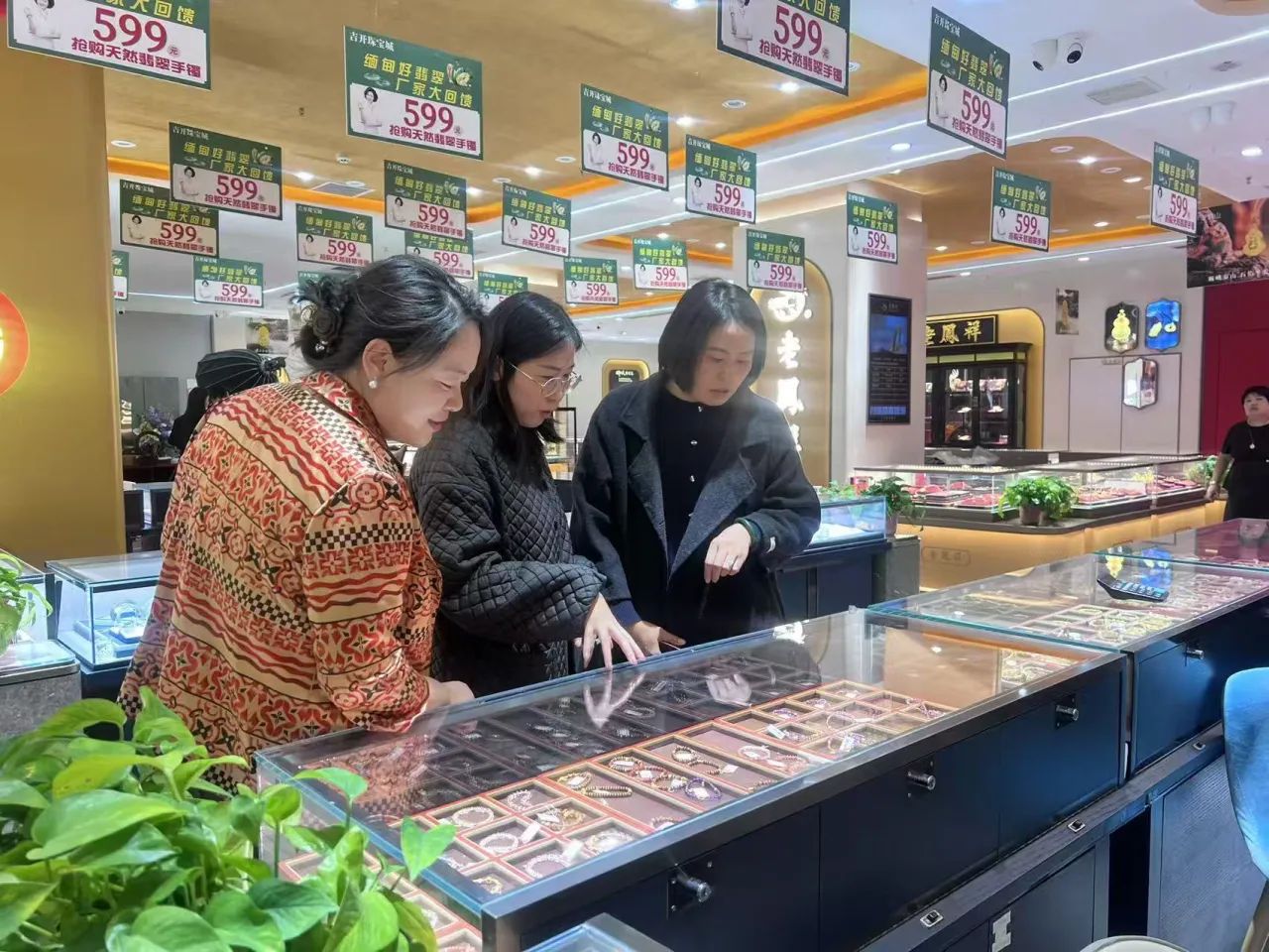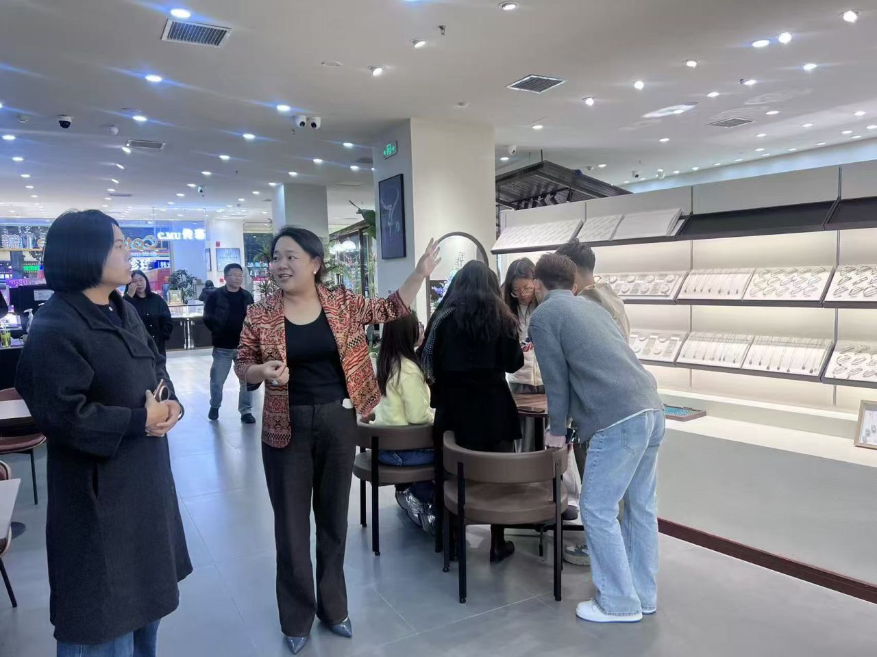 座谈结束后,在石家庄吉开珠宝城管理团队的陪同下,金翠玲副院长、辅导员张曼琳实地参观了珠宝城的产品展示区、定制加工车间、鉴定检测中心与门店运营现场。在定制加工车间,双方就“古法金工艺传承”“新媒体运营”等行业前沿话题展开交流,金翠玲副院长表示,后续学院将结合企业技术需求,调整实践教学内容,让人才培养更贴合行业实际;辅导员张曼琳则现场记录了企业各岗位的工作场景与实操要求,为后续精准开展就业指导、推送岗位信息积累一手资料。