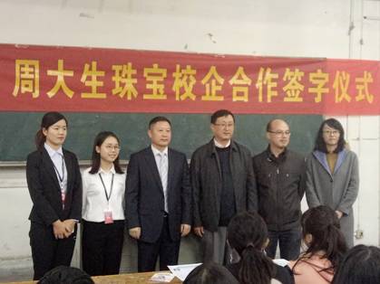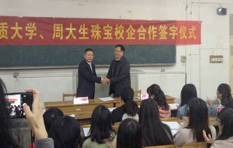 教学二号楼212教室举行。参加此次签约仪式的有:宝石与材料工艺学院院长王礼胜、党总支书记黄本春、辅导员老师张曼琳以及周大生珠宝股份有限公司人力资源部熊新祥总经理、校园招聘负责人王燕女士。