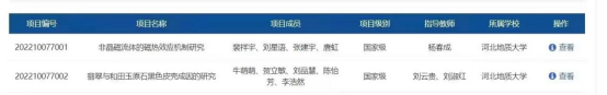 获批两项国家级大学生创业创新训练计划,分别是由杨春成老师指导,裴祥宇,刘星语,张建宇,唐虹同学共同参与的非晶磁流体的磁热效应机制研究项目和刘云贵,刘淑红老师指导,牛萌萌,贺立敏,刘品慧,陈怡芳,李浩然同学共同参与的翡翠与和田玉原石黑色皮壳成因的研究项目。
