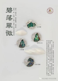 由金翠玲老师指导完成的设计作品“碧落翠微”,使用到中国传统工艺“螺钿”技法进行制作,在设计中传承了中国传统文化,体现了工匠精神,作品中包含山峰、建筑、渔船等设计元素,表现了祖国的大好河山。(图二)