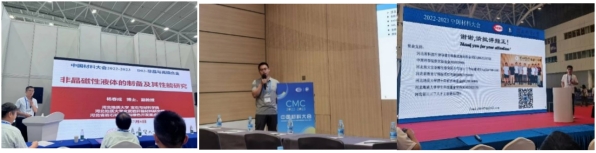 杨春成老师在非晶与高熵合金分会场作了题为“非晶磁性液体的制备及其性能研究”的口头报告;刘昶江老师在资源材料与循环利用分会场作了题为“玄武岩纤维原料特征与成纤性能调控”的邀请报告;袁钊同学在纤维材料改性与复合技术分会场作了题为“具有超亲水和水下超疏油的TiO2修饰玄武岩纤维布的制备及应用”的快闪报告。会上,四位师生与相关专家进行了深入交流。