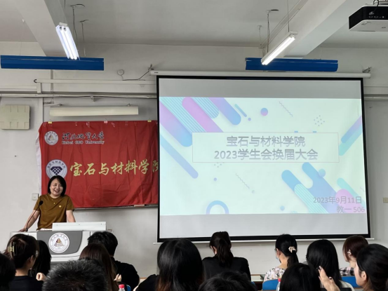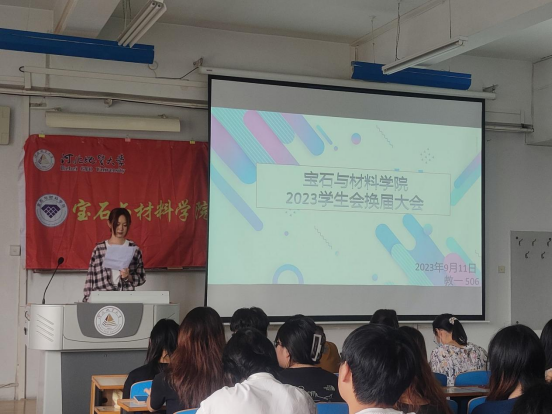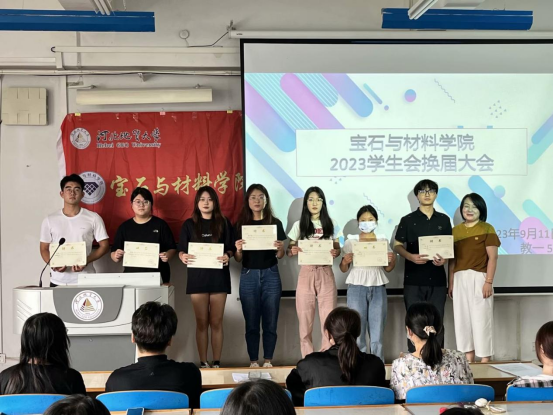 大会第二项,主持人宣读新一届学生干部名单,并由谷书记为2023届学生会执行主席和团委副书记颁发聘书,由张老师和边老师为2023届学生会部长颁发聘书。