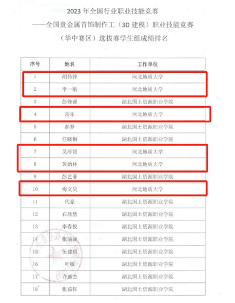 吴淳贤、常乐、梅文昊、胡伟峰、黄始林、李一航6名同学参加了第六届全国珠宝玉石检测制作职业技能竞赛——全国贵金属首饰制作(3D建模)职业技能竞赛(华中赛区)。其中胡伟峰、李一航和常乐晋级全国总决赛。