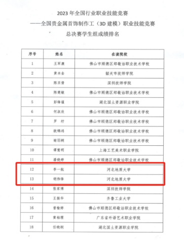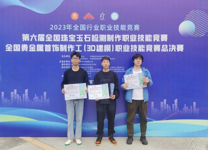 2023年12月13日,胡伟峰、常乐、李一航3名同学参加了第六届全国珠宝玉石检测制作职业技能竞赛——全国贵金属首饰制作(3D建模)职业技能竞赛(总决赛)。其中胡伟峰、李一航和常乐晋级全国总决赛,其中李一航、胡伟峰两名同学在总决赛荣获学生组两枚铜奖殊荣,常乐荣获学生组新星奖。