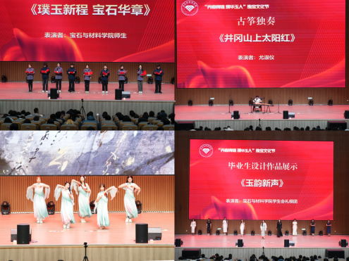 四步铸魂工程,展示育人成效。22日下午,文化节文艺汇演暨闭幕式在春秋讲堂隆重举行。文艺汇演循着学院“璞华玉人”铸魂工程四步工作法徐徐展开,从“浴火而生”的理想树立,到“信念永恒”的执着坚守,从“千般磨砺”的意志锤炼,再到“玉汝于成”的人才造就,不仅是一场珠宝文化的盛宴,更是一代代宝石学子成长轨迹的生动缩影,全面展现了学院育人成效。汇演以一曲激昂深情的古筝演奏《井冈山上太阳红》奏响序章,跳跃的音符诠释了学子们红宝石般的炽热初心和黄金般的坚定信念,迅速将现场氛围推向高潮。
